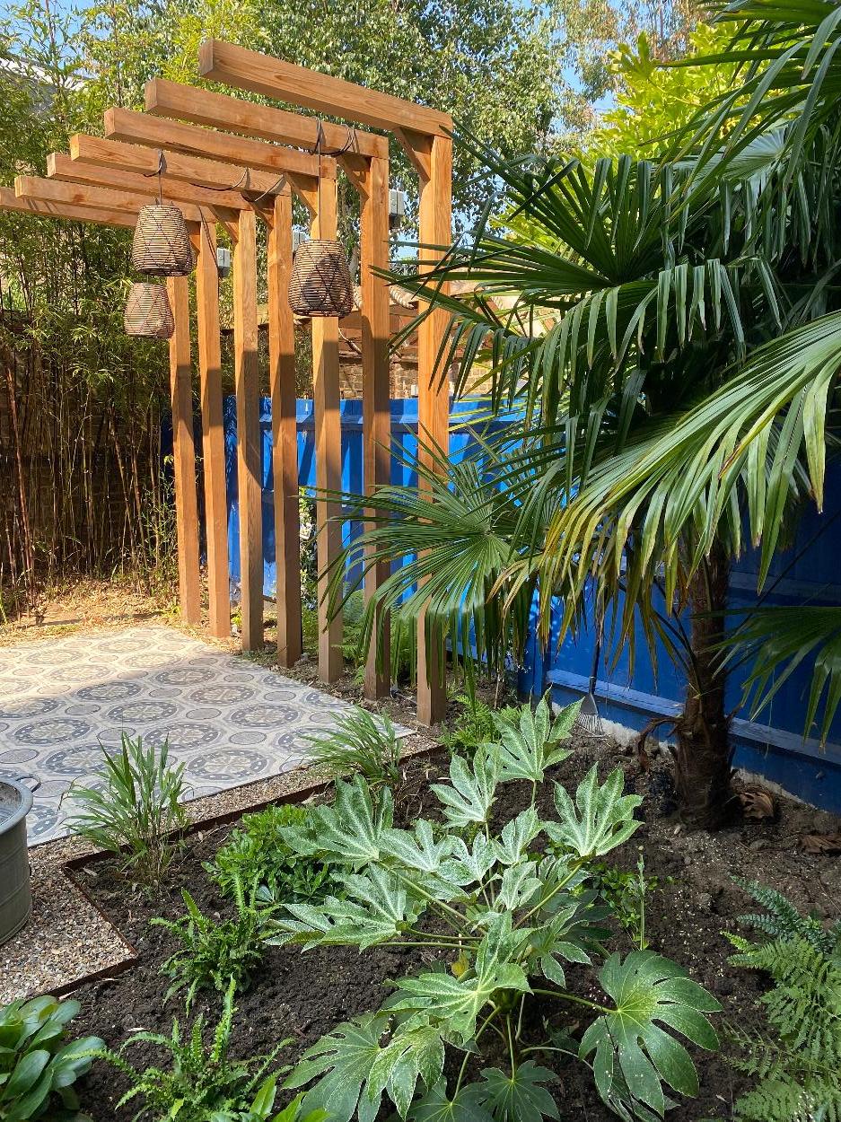 Rather than working against the shade, the design embraces it. A layered planting scheme was developed to create depth, texture, and a richly green atmosphere, drawing on tropical-inspired foliage that thrives in low-light conditions.