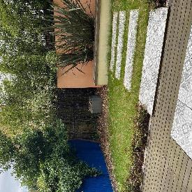 Brief: A lush, tropical-inspired garden designed for relaxation and entertaining within a green, tranquil setting.